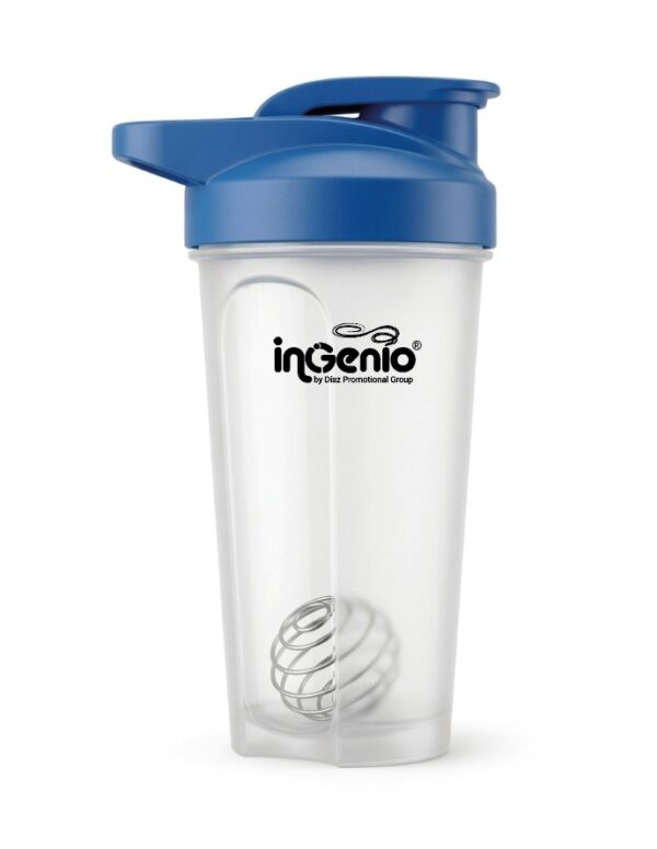 - Incluye: Vaso translúcido, tapa azul hermética y esfera mezcladora metálica.